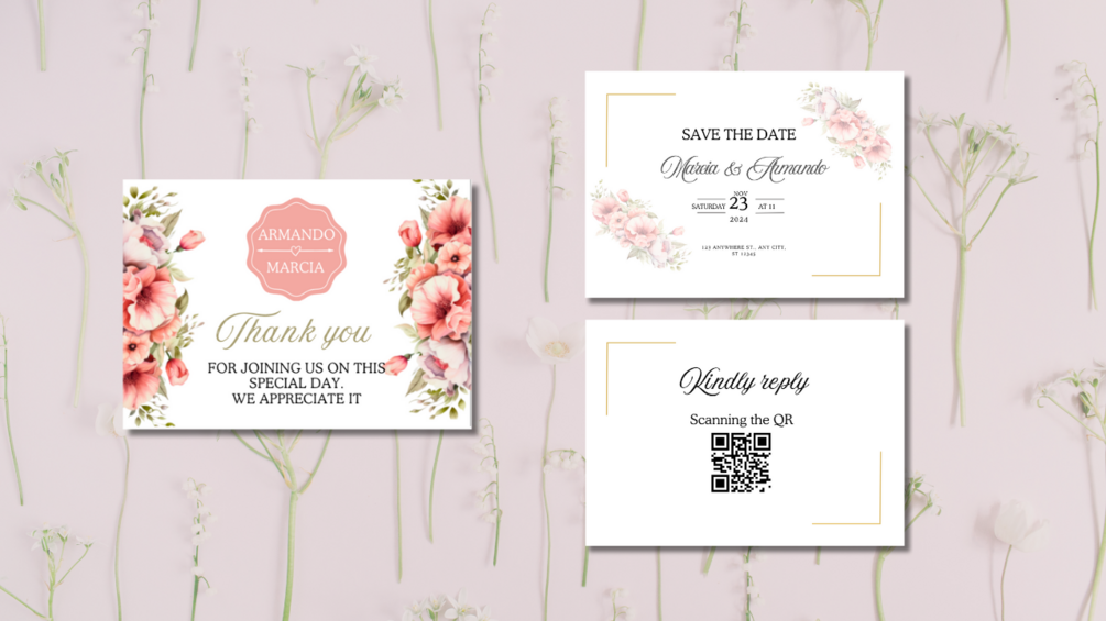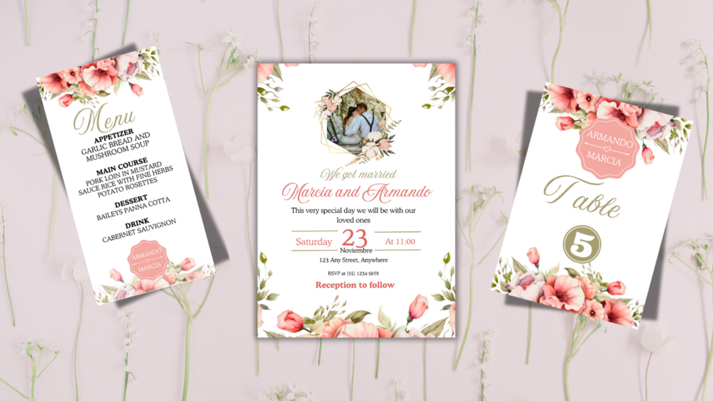 Wedding invitation template, save the date, menu, table number. Editable in CANVA